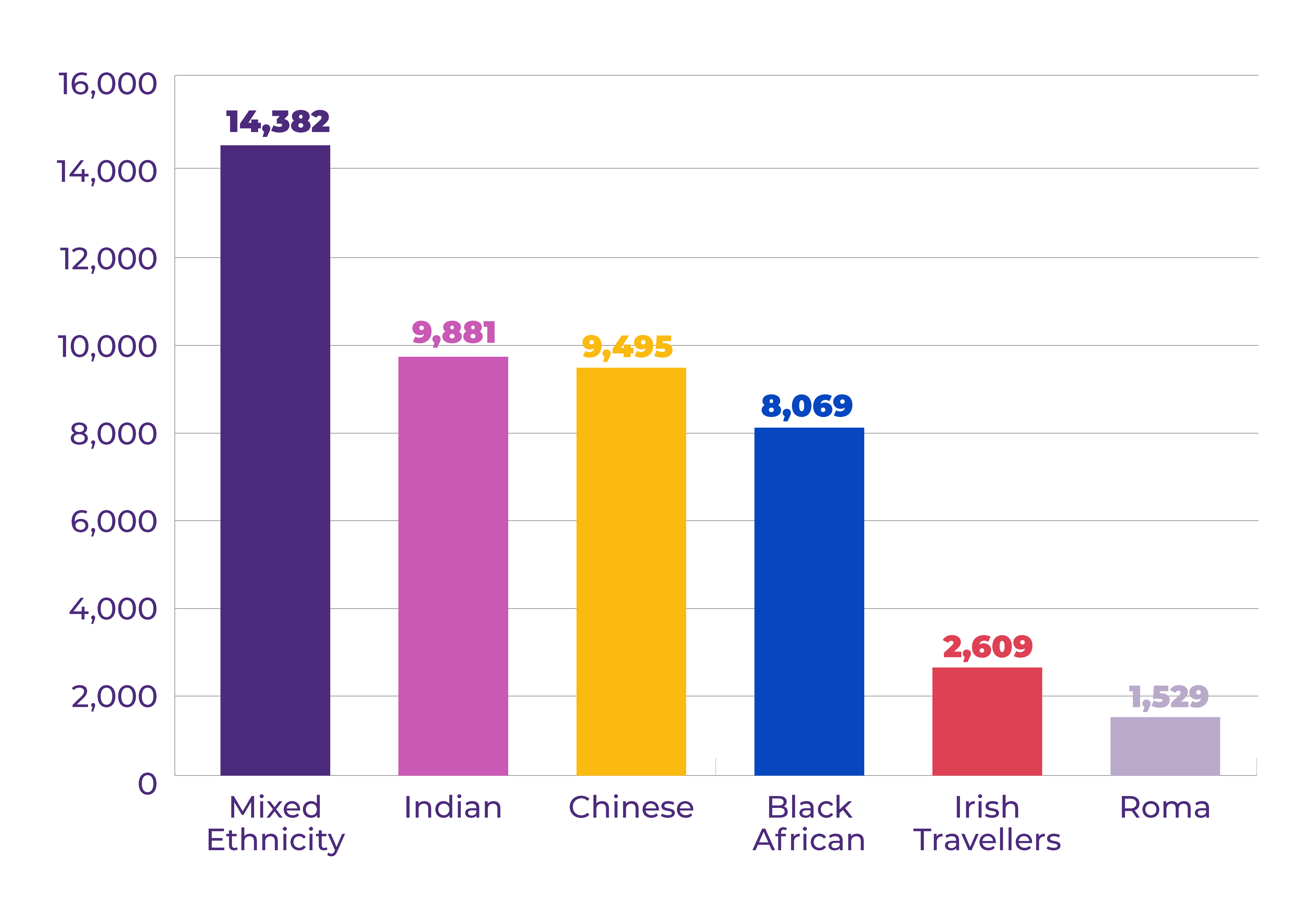 The 2021 census in Northern Ireland (Census 2021) highlights the growing ethnic diversity in the region. The ethnic minority groups with the highest prevalence were those belonging to the Mixed Ethnicity (14,382) categorisation, followed by those belonging to the Indian (9,881), Chinese (9,495), and Black African (8,069) ethnicity categorisations. Irish Travellers accounted for 0.14% (2,609) of the All Usual Resident population and Roma 0.08% (1,529).